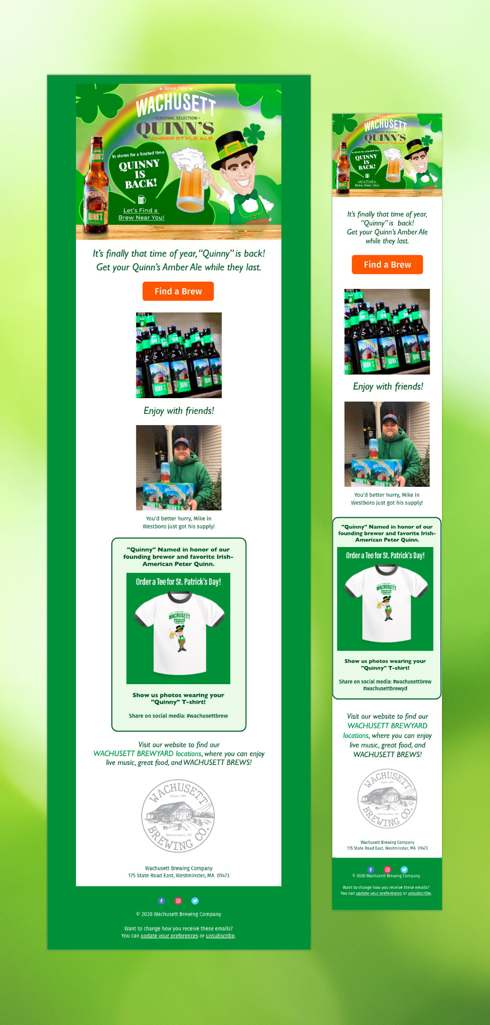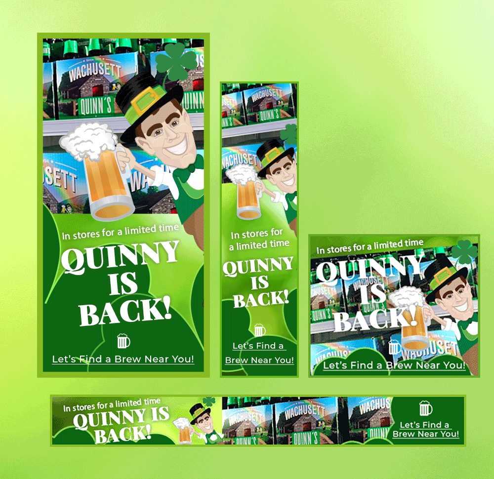 The original “Quinny” Leprechaun was a pen & ink illustration I drew after meeting with the owners, and sketching from some photographs of Pete. More recently, I recreated the illustration as vector artwork so that Quinny can be used in a variety of applications. The digital illustration of Quinny was created in Illustrator using my original pen & ink as reference. The animated GIF at the top of this page was first created in After Effects, then optimized and exported out of Photoshop.
