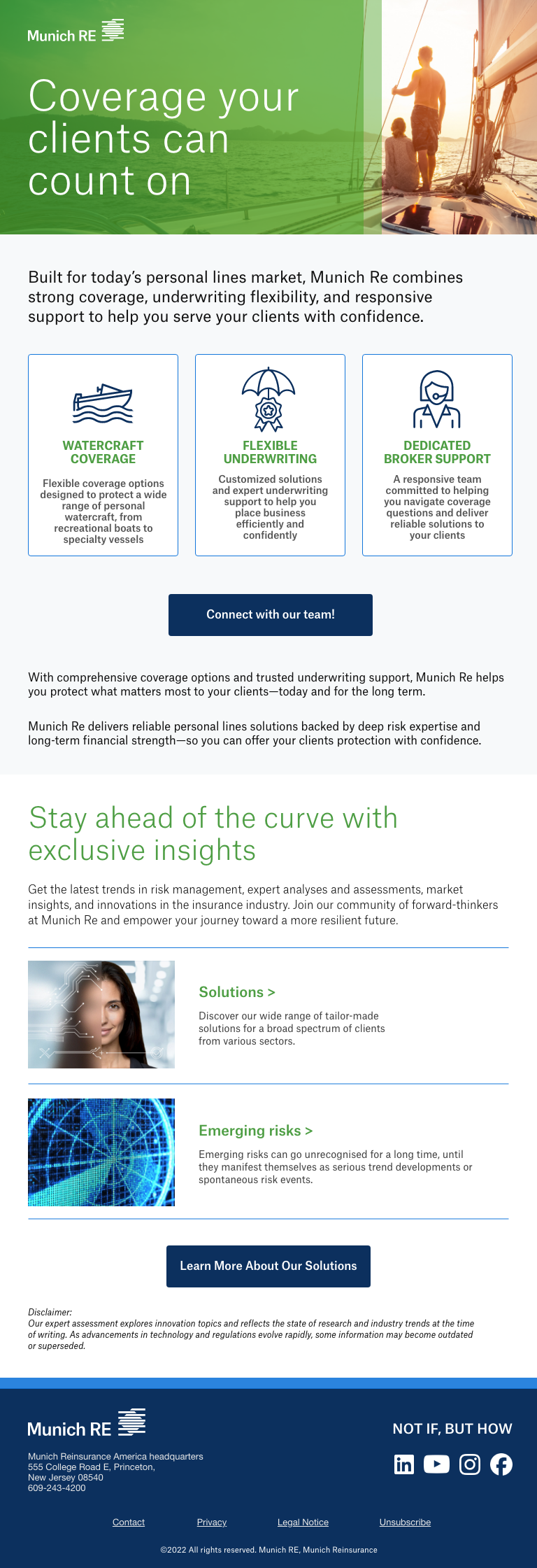 For Munich Re’s evolving brand system, I led visual direction and digital design across interactive brochures, display advertising, and CRM concept extensions. The goal was to create a flexible campaign framework that could scale across channels and adapt to different product offerings while maintaining clarity, trust, and brand consistency.